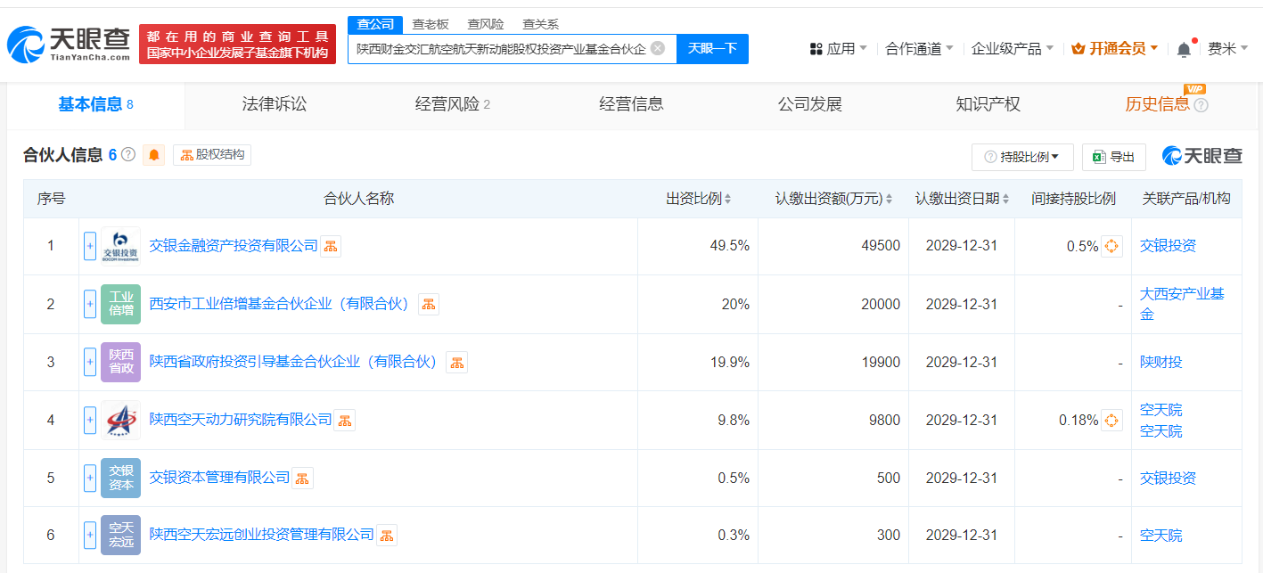 每经AI快讯,天眼查App显示,近日,陕西财金交汇航空航天新动能股权投资产业基金合伙企业(有限合伙)成立,执行事务合伙人为陕西空天宏远创业投资管理有限公司、交银资本管理有限公司,出资额10亿人民币,经营范围为以私募基金从事股权投资、投资管理、资产管理等活动,由交银金融资产投资有限公司、西安市工业倍增基金合伙企业(有限合伙)、陕西省政府投资引导基金合伙企业(有限合伙)等共同出资。